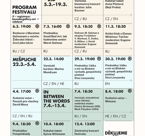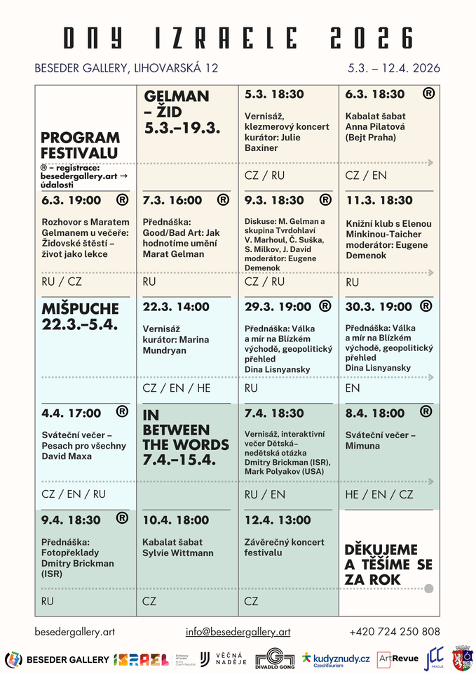 V roce 2026 se Beseder Gallery již popáté stává prostorem festivalu „Dny Izraele“ — série výstav a událostí věnovaných umění, židovské kultuře a zkušenosti života mezi zeměmi, jazyky a identitami.