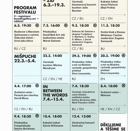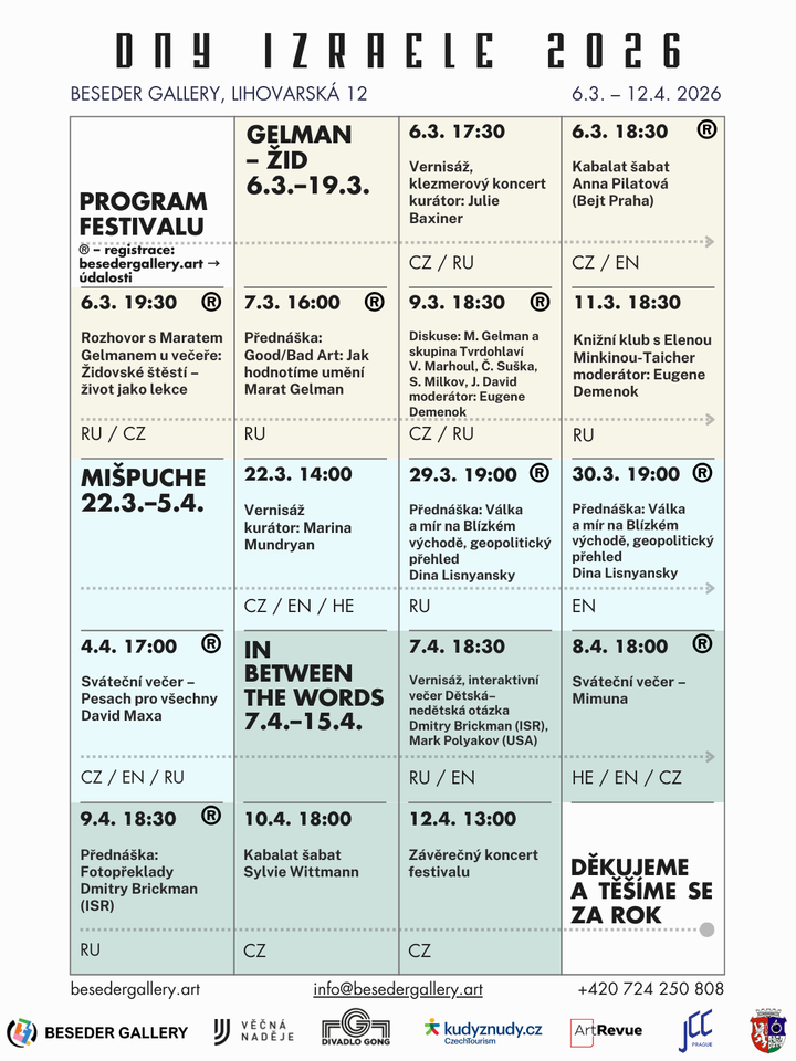 V roce 2026 se Beseder Gallery již popáté stává prostorem festivalu „Dny Izraele“ — série výstav a událostí věnovaných umění, židovské kultuře a zkušenosti života mezi zeměmi, jazyky a identitami.